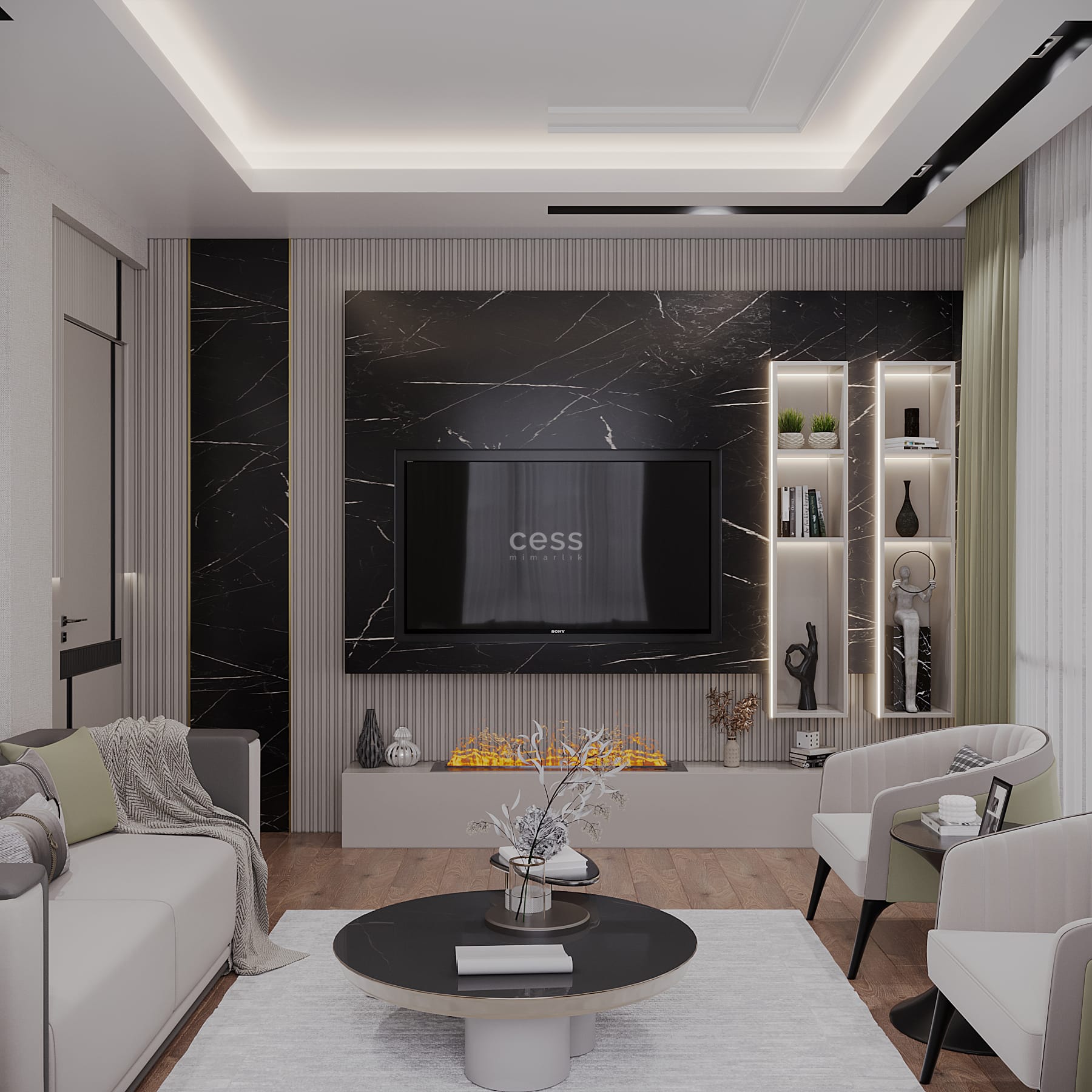 Banyonun şık seramik detayları ve modern armatürleri, temiz ve sofistike bir görünüm sunarken, dairenin genelinde kullanılan doğal dokular, modern tasarım öğeleri ile dengeli bir uyum yakalıyor. Asma tavan modelleri banyoda da kullanılarak, iç mimar yaklaşımının her alanda kendini göstermesini sağlıyor.