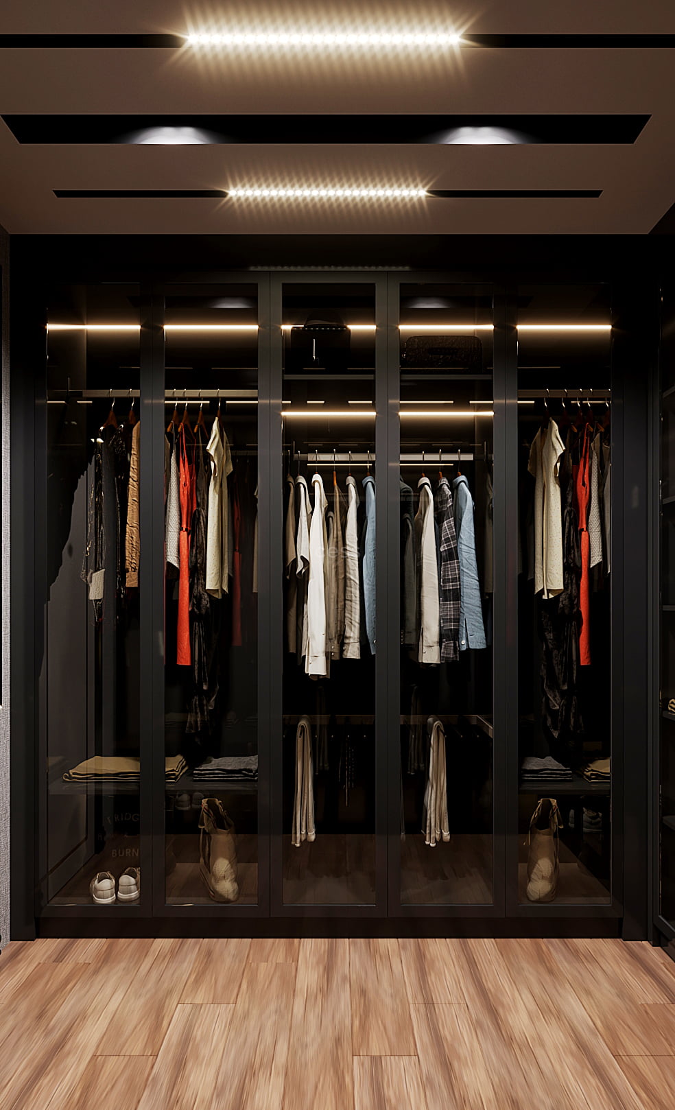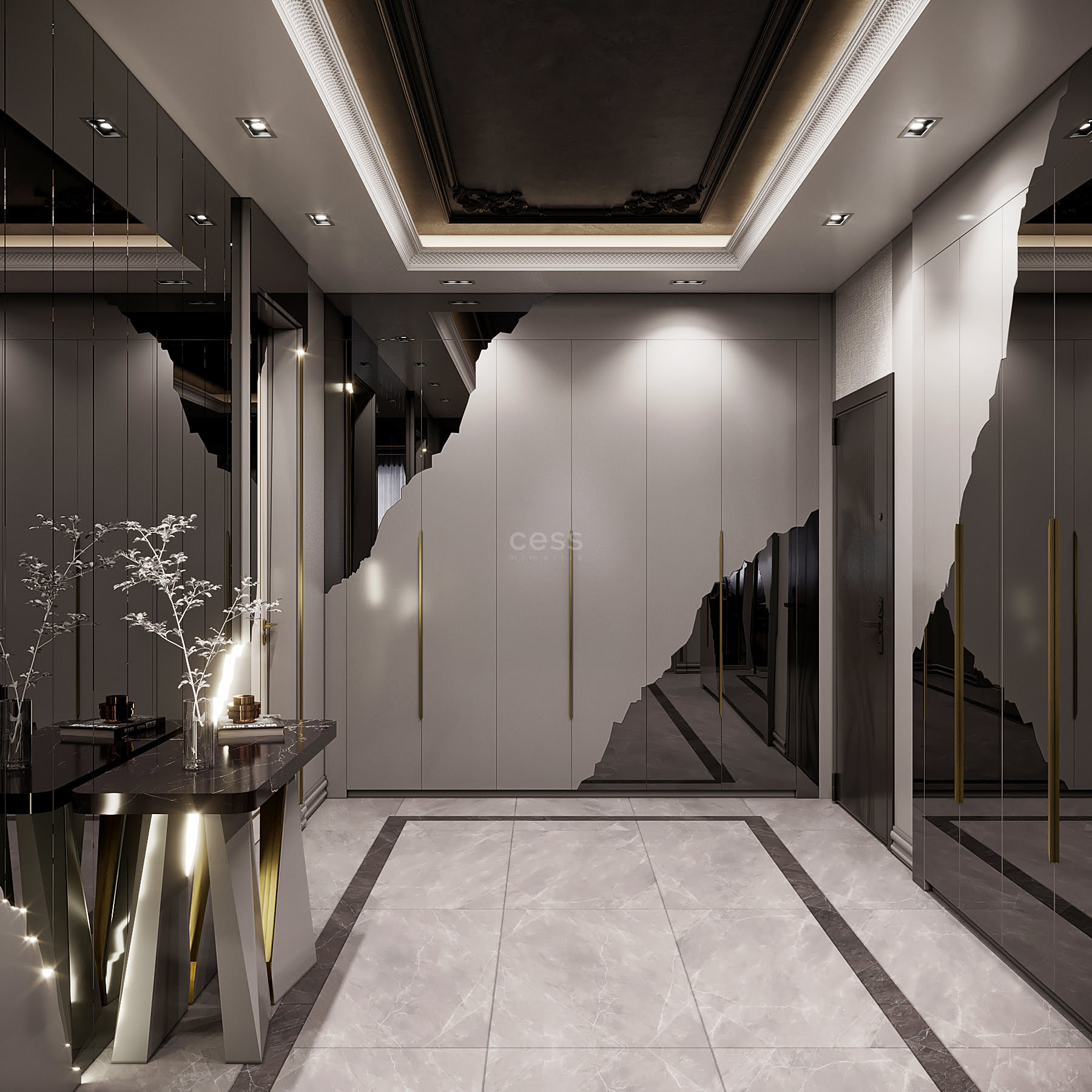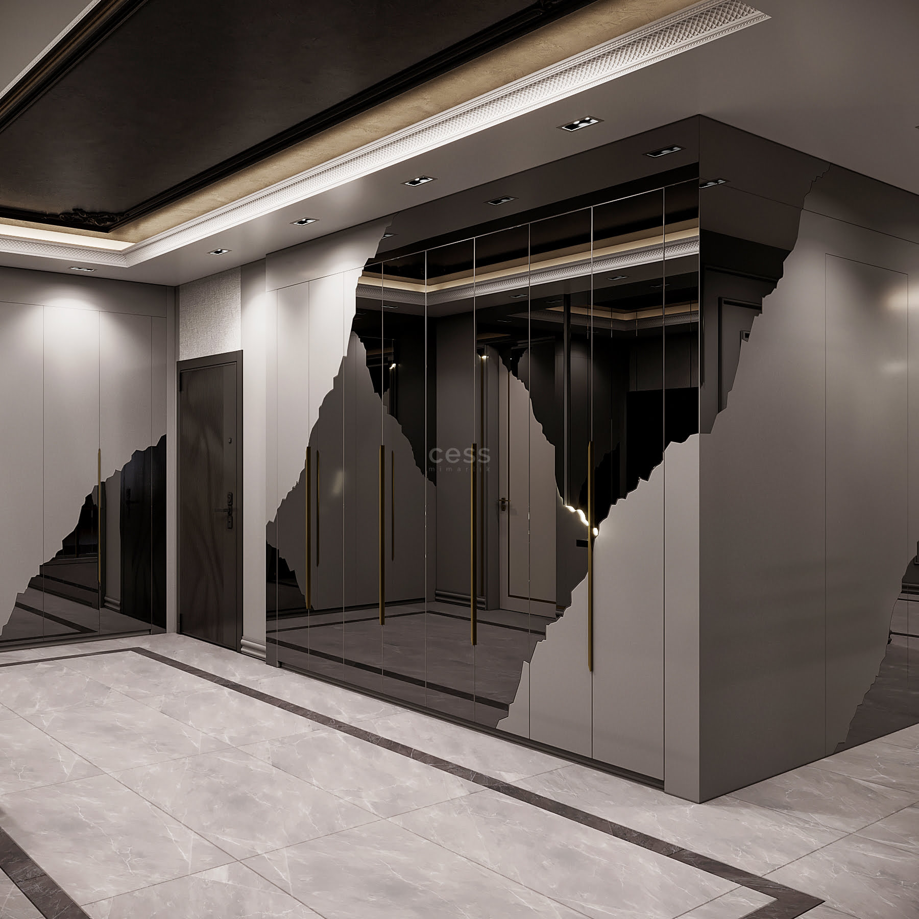 Ev projeleri denildiğinde antre, evin karakterini belirleyen ilk alanlardan biridir. Öz Ailesi için tasarladığımız bu antrede, iç mimar dokunuşlarının zarif izlerini görebilirsiniz. Geniş ayna panelleri ve yumuşak aydınlatmalarla mekanın ferahlığı vurgulanmıştır. Siyah ve prinç detaylar ise lüksü temsil eden unsurlar olarak ön plana çıkmaktadır.