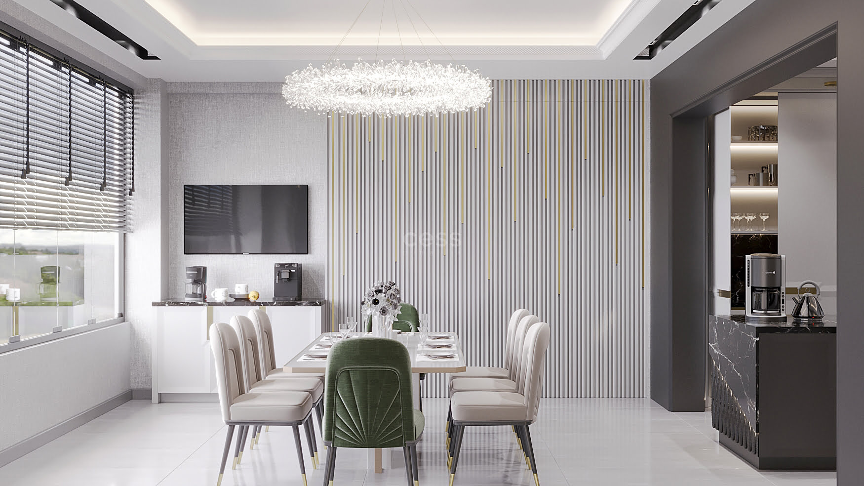 Bu ev tasarımları kapsamında, salonun zarafeti ve konforu ön planda tutuldu. Krem ve pastel tonlarındaki koltuklar, salonun sıcak ve davetkar bir atmosfer yaratmasını sağlarken, dikkatlice seçilen aydınlatmalar dekorasyon projeleri için en iyi örneklerden biri olarak öne çıkıyor. Bu alanda kullanılan altın detaylar, mekana modern bir dokunuş katıyor.